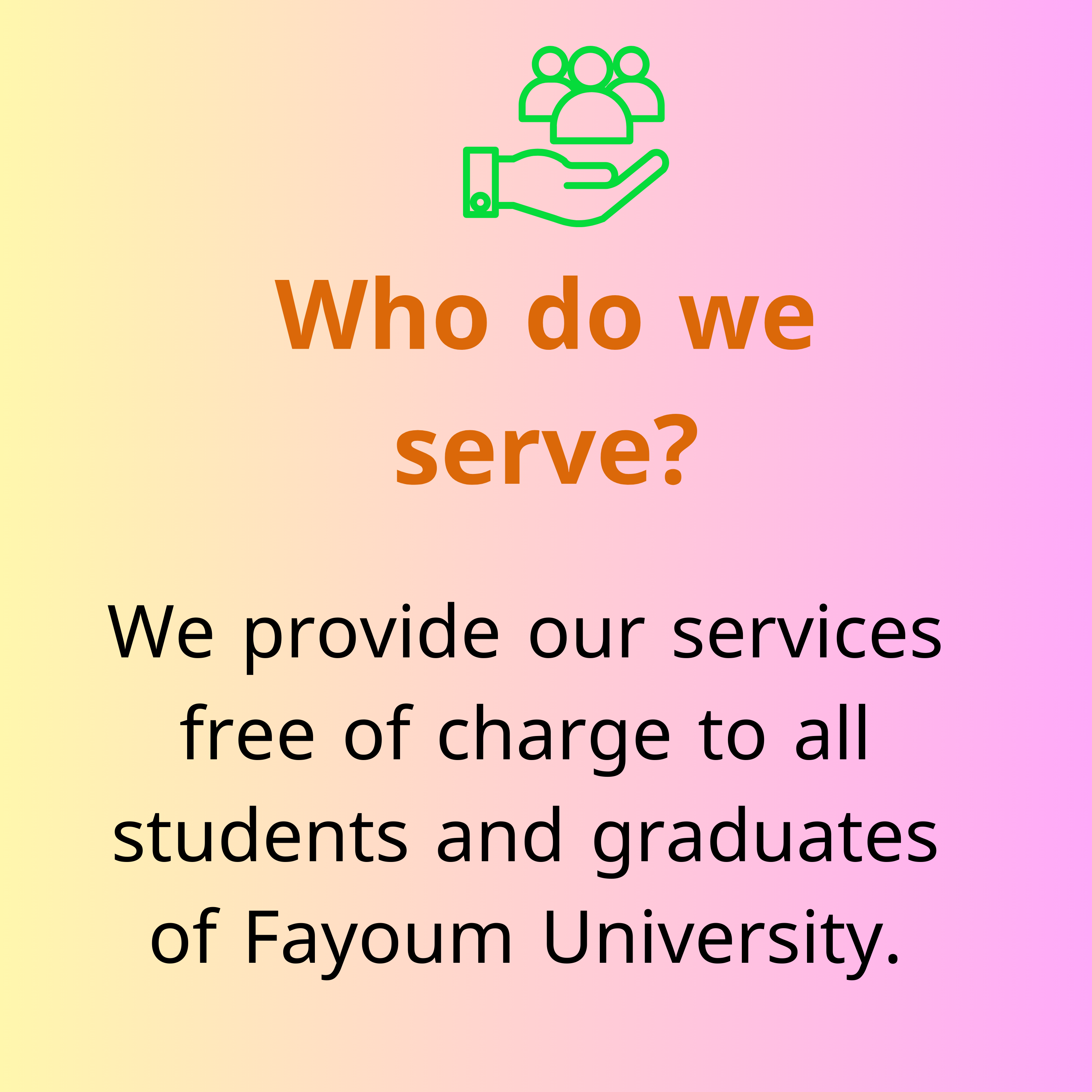 If you have any suggestions or other services that you believe we can provide, please do not hesitate to contact us, we offer Career development services for students and graduates of Fayoum University, as well as job opportunities in collaboration with major local, national and international companies